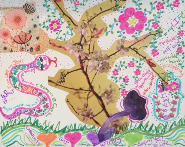 - Collage (with magazine photos/text you’re intuitively drawn to), draw, doodle, write, and/or paint your way to understanding who you were born to be by participating in Vicki’s simple Art Visioning art journal prompts.
