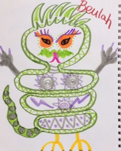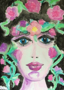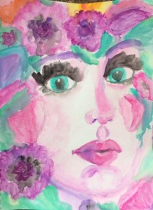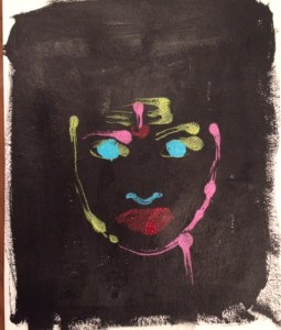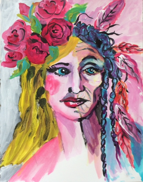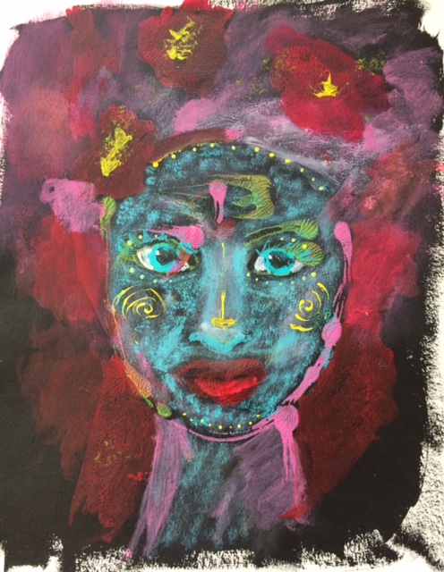 Here are my Future Elder Warrioress and Priestess, who encompasses the freshness of youth and the ancient wisdom of my Future Elder Warrioress. I created them using the attached monoprint outlines that you can use to create your own. I used watery acrylic paints to decorate and embellish mine. You might also use collage material, markers or Crayons.