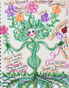 - Record your discoveries in your art journal – draw, doodle, paint, write, collage your way to soul clarity. Use images, words, favorite quotes, poems, minds maps, colors, etc. Mix up creativity techniques.