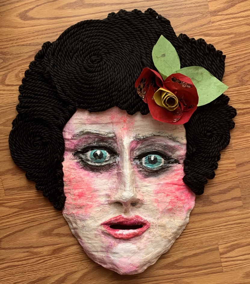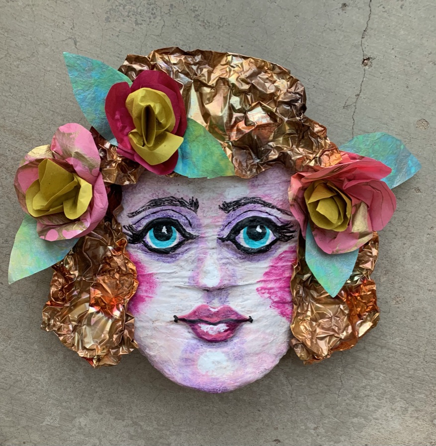 What are fairytale masks? I begin each larger-than-life mask by sculpting the forms with wire mesh. Then, I wrap each piece with canvas strips that are infused with Plaster of Paris. Once the masks have dried, I paint the features with acrylic paint, and adorn the characters with paper flowers, copper sheets, yarn, bits of paper, or fabric.