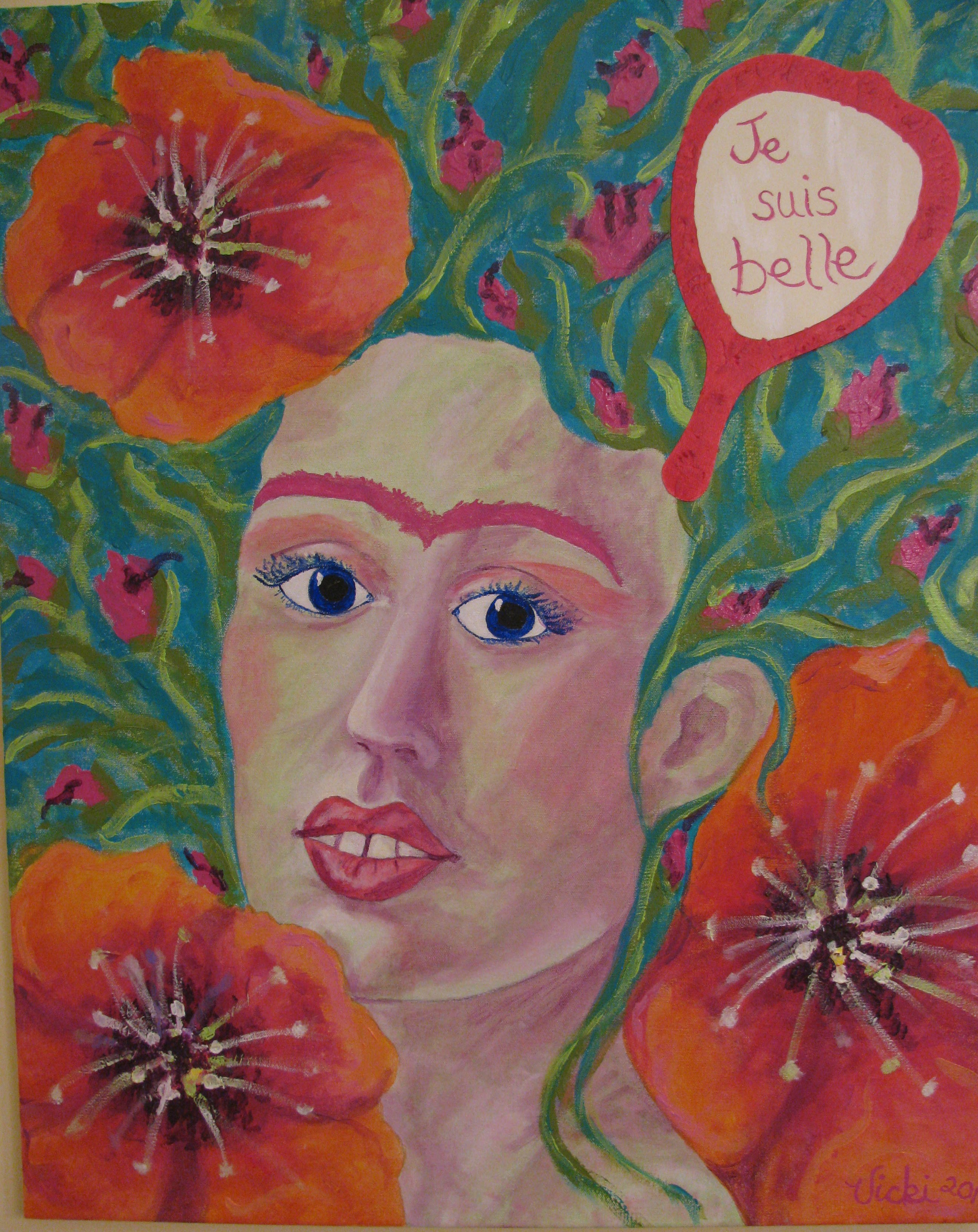 Then, I went to a Rene Magritte exhibit at the Museum of Modern Art in NYC. Love! I was so taken with Magritte’s use of French words to label things that were not always what they really seemed. So fascinating, like painting riddles. So, I decided to add my own take in Je Suis Belle by writing this phrase on a hand mirror facing the viewer.